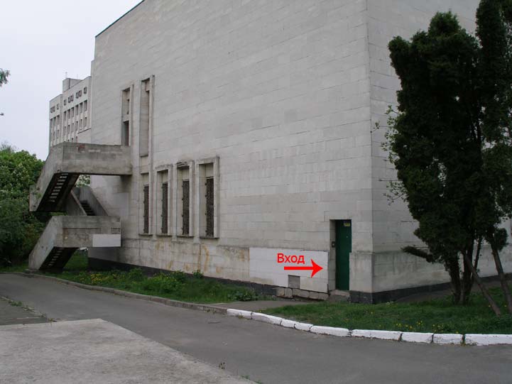 Вход - на левом углу корпуса, в торце сбоку, зеленая железная дверь (в центральный вход заходить не надо).